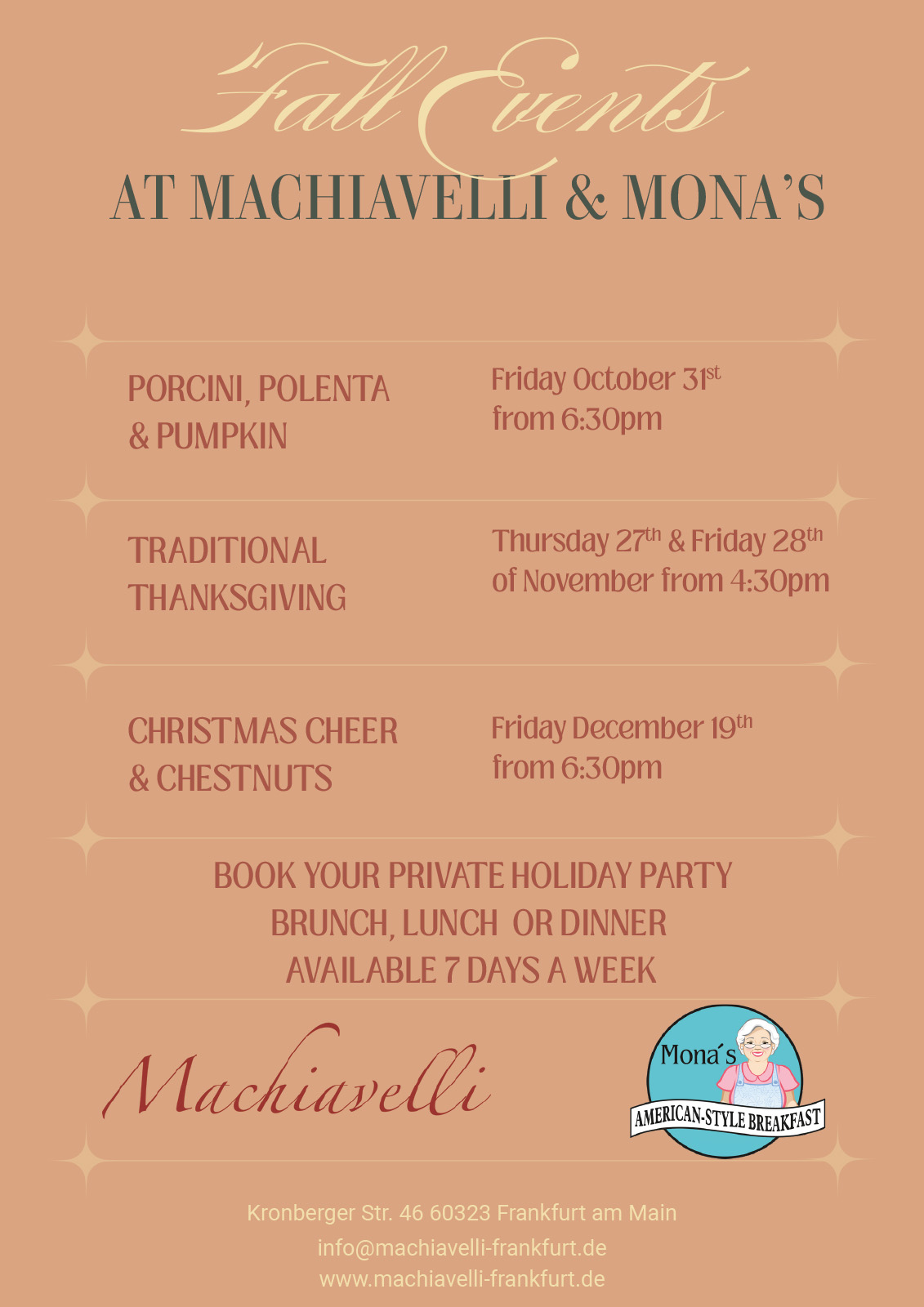 Mona’s brings over 68 years of authentic American breakfast recipes to you, right in the heart of Frankfurt’s westend. New York Eggs Benedict, homemade hashbrowns, Lumberjack stack of buttermilk pancakes, Bacon and Eggs – the works!